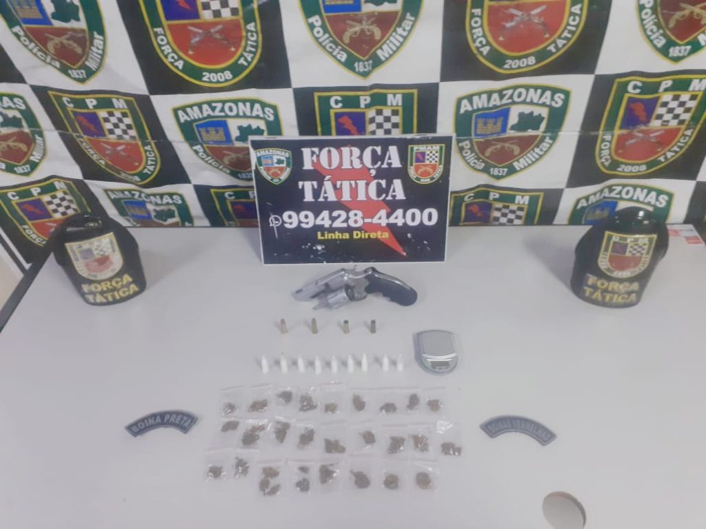 Policiais militares da Força Tática detiveram, na tarde de terça-feira (31/03), um homem de 23 anos suspeito de porte ilegal de arma de fogo e tráfico de drogas no bairro Alvorada, zona centro-oeste da capital. Com ele os policiais apreenderam um revólver de marca Ruger e calibre 38; duas munições deflagradas; uma munição percutida, mas não deflagrada; uma munição intacta; 26 trouxinhas de supostamente maconha; nove pinos de supostamente cocaína; e uma balança de precisão.