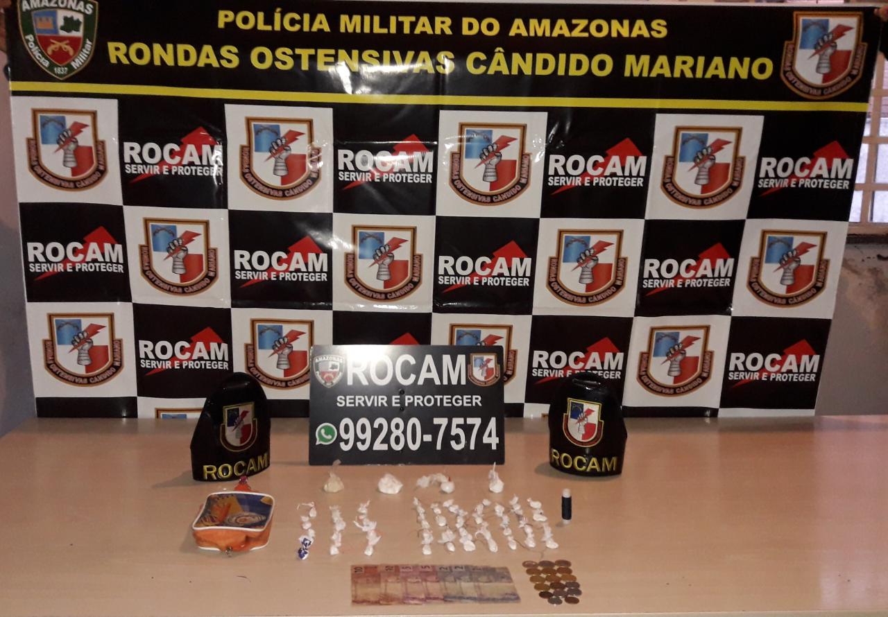 Policiais militares da Rondas Ostensivas Cândido Mariano (Rocam) detiveram, na tarde desta quinta-feira (16/04), um homem de 20 anos suspeito de tráfico de drogas, no bairro Monte Sião, zona Leste da capital. Com ele, os policiais apreenderam 40 trouxinhas de supostamente cocaína, duas porções médias de supostamente cocaína, duas porções médias de supostamente pasta base de cocaína e a quantia de R$ 42 em espécie.