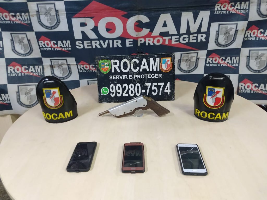 Policiais militares das Rondas Ostensivas Cândido Mariano (Rocam) detiveram, na noite deste domingo (22/03), um homem de 23 anos suspeito de roubo no bairro Redenção, zona centro-oeste da capital. Com ele os policiais apreenderam um simulacro de arma de fogo, uma motocicleta com restrição de roubo e três aparelhos celulares supostamente roubados.