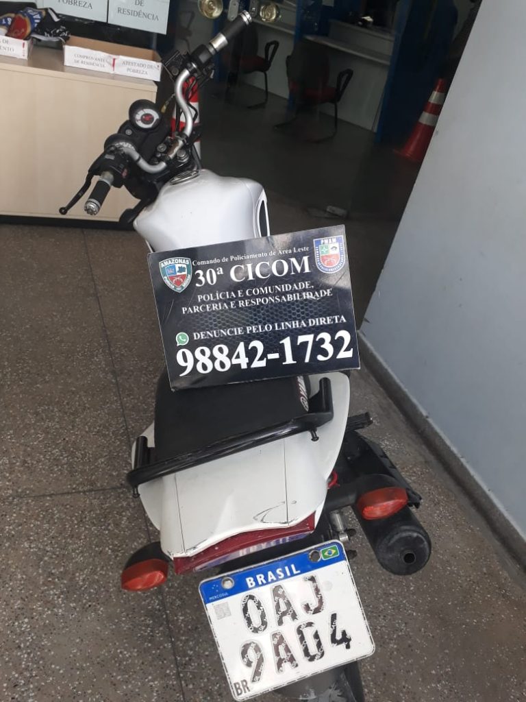 Os policiais foram à residência do suspeito, onde foi localizada uma motocicleta de cor branca e placa OAJ 9A04. Após consulta junto ao Centro Integrado de Operações de Segurança (CIOPS), foi constatada restrição de roubo.