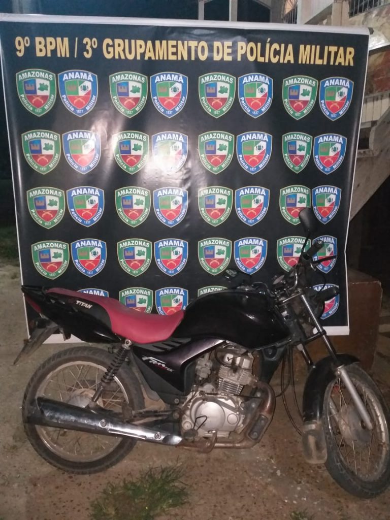 Policiais militares do 3º Grupamento da Polícia Militar (GPM), por meio do 9º Batalhão da Polícia Militar (BPM) apreenderam, na noite deste domingo (09/08), durante a operação Gavião Real II, uma motocicleta com restrição de roubo na estrada Anamã Cuia, no município de Anamã (a 165 quilômetros de Manaus).