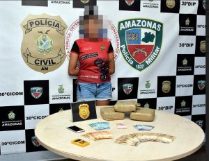 A Polícia Civil do Amazonas, por meio da equipe de investigação do 30° Distrito Integrado de Polícia (DIP) e em conjunto com policiais militares da 30ª Companhia Interativa Comunitária (Cicom), prendeu em flagrante, na noite desta quinta-feira (10/1), por volta das 19h, Brenna Barbosa Sousa, 23, com três quilos e meio de substâncias entorpecentes. A jovem foi apresentada durante coletiva imprensa, na manhã desta sexta-feira (11/1). O delegado Torquato Mozer, titular do 30° DIP, e o comandante da 30ª Cicom, major Guilherme Sette, coordenaram a ação policial.