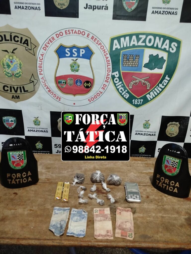 Ainda em Japurá, outro suspeito foi preso por suspeita de envolvimento com o tráfico de drogas. Com ele foram apreendidos cerca de 100 gramas de maconha do tipo skunk e oito porções da mesma droga.