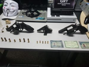 Com os suspeitos, a polícia encontrou uma pistola de calibre 635 e cinco munições, dois revólveres calibre 38, porções de entorpecentes, seis relógios, quatro televisores, quatro tabletes, 13 celulares, dois notebooks, um videogame, além de máscaras que eram usadas durante as ações. As pessoas que reconhecerem os autores podem se direcionar ao 12º DIP para informar a polícia.