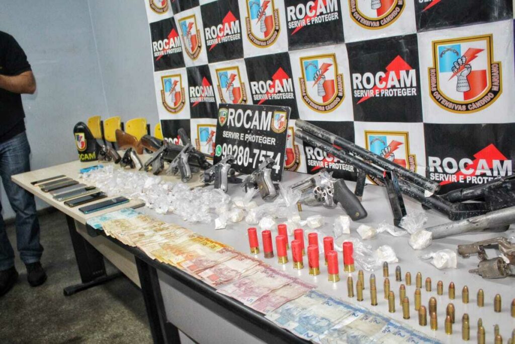 A Polícia Militar do Amazonas prendeu três membros de uma facção criminosa em posse de um arsenal no bairro Monte das Oliveiras, na zona norte de Manaus. Com extensa ficha criminal, os infratores foram flagrados com 14 armas de fogo, munições e centenas de porções de entorpecentes.