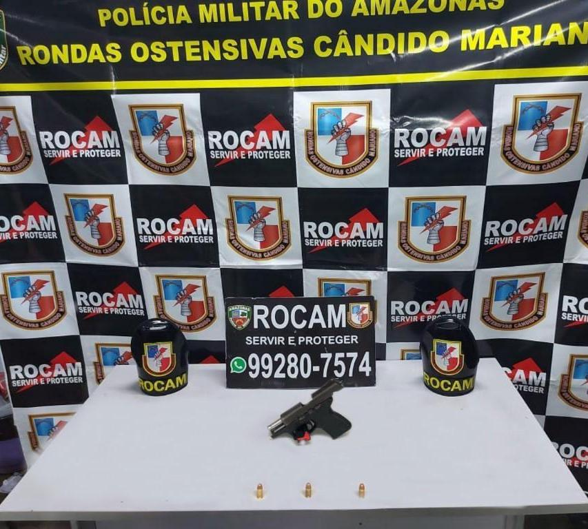 Ao se aproximarem do suspeito, realizaram abordagem e, ao efetuar revista pessoal, encontraram na cintura do rapaz uma pistola calibre 380, da marca Taurus, modelo PT 138 e numeração HRK 90328, além de um carregador calibre 380 ACP e três munições intactas CBC do mesmo calibre.