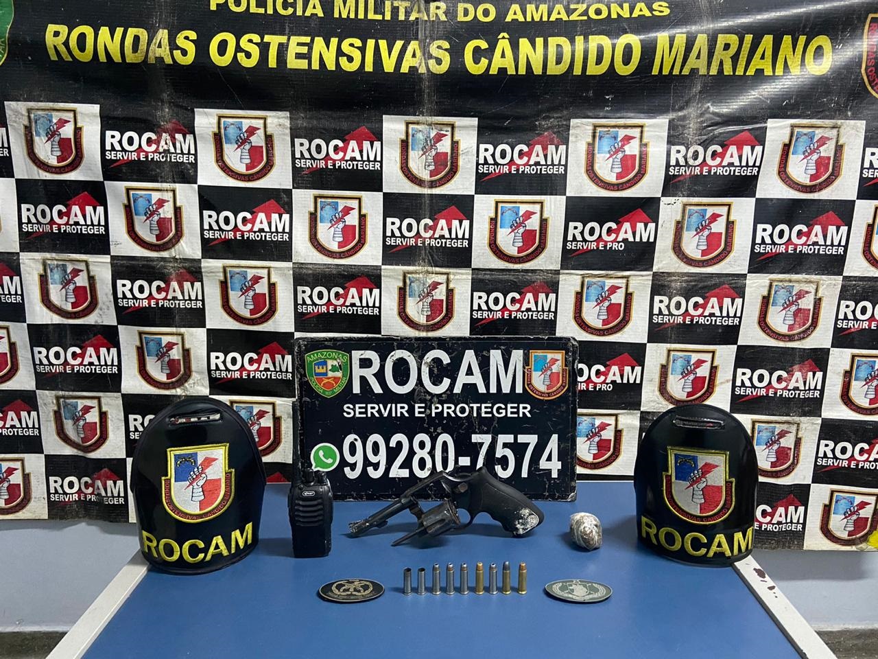 Policiais militares das Rondas Ostensivas Cândido Mariano (Rocam) apreenderam, na noite desta segunda-feira (27/01), um revólver calibre 38, marca Taurus, com numeração suprimida, sete munições calibre 38, sendo duas delas deflagradas, um rádio comunicador e uma porção pequena de supostamente maconha no bairro Alfredo Nascimento, zona leste da capital.