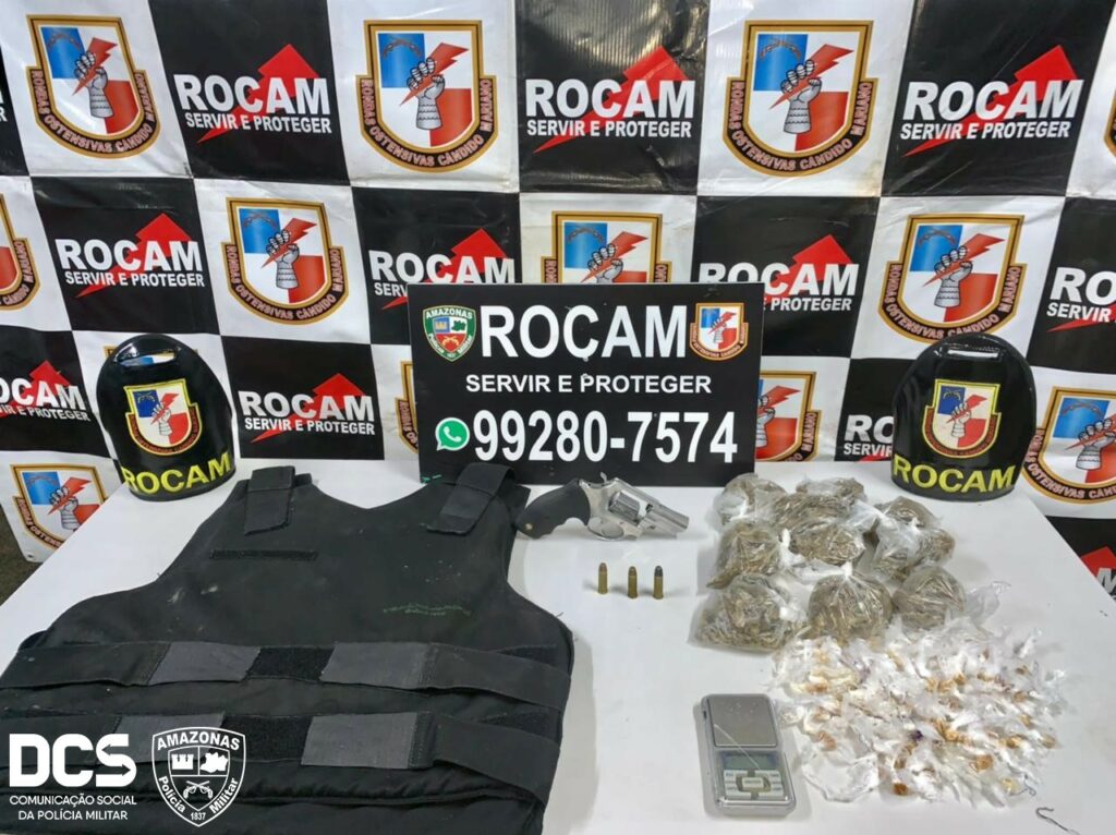 Policiais militares das Rondas Ostensivas Cândido Mariano (Rocam) apreenderam, durante ações distintas, ocorridas entre a noite de quarta-feira (10/03) e madrugada desta quinta-feira (11/03), uma arma de fogo, munições e diversas porções de drogas, nas zonas sul e norte da capital. Dois homens de 30 e 33 anos foram detidos nas ações, sendo um deles foragido da justiça.