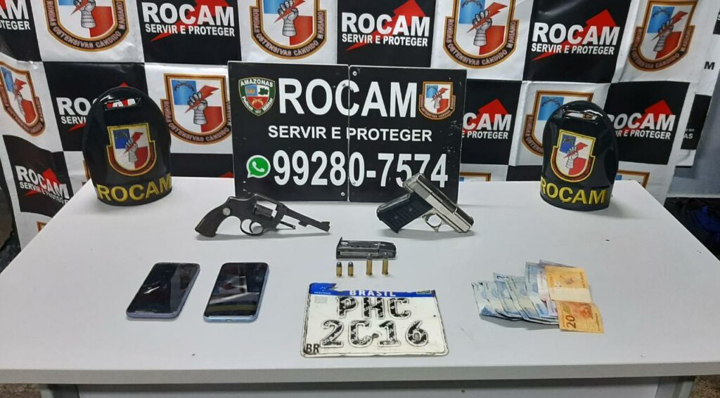 A equipe realizava patrulhamento na avenida Perimetral, bairro Parque 10, quando avistou dois homens em uma motocicleta em atitude suspeita. Foi dada ordem de parada, mas o condutor não obedeceu e tentou fugir, perdendo o controle da motocicleta, que caiu com os dois ocupantes. Os militares detiveram os dois suspeitos, com quem foram encontradas duas armas de fogo.