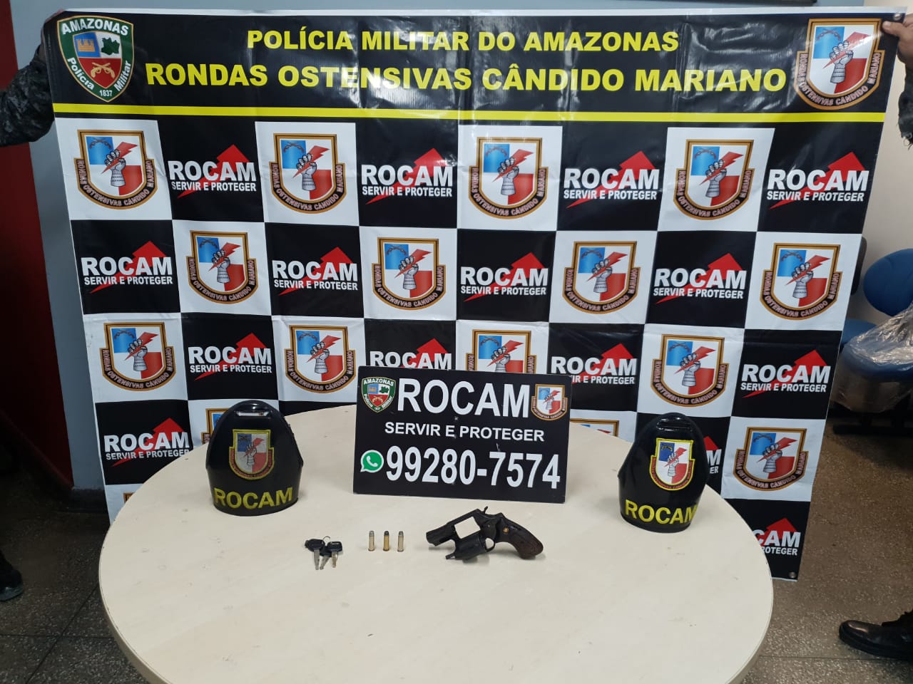 Policiais militares das Rondas Ostensivas Cândido Mariano (Rocam) detiveram, na tarde desta quinta-feira (09/07), um homem de 30 anos por posse ilegal de arma de fogo e receptação na comunidade Novo Reino, bairro Tancredo Neves, zona leste da capital. Com ele, os policiais apreenderam um revólver calibre 38, marca Taurus, numeração HE43690, três munições CBC, calibre 38, intactas e uma motocicleta modelo Bros de placa JXM-8431.