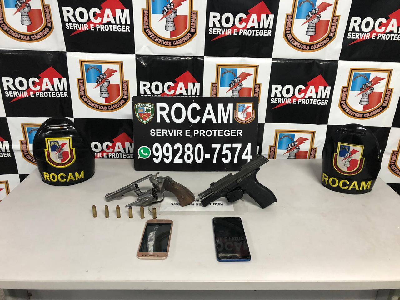Policiais militares das Rondas Ostensivas Cândido Mariano (Rocam) detiveram, na madrugada desta segunda-feira (25/05), um homem por posse ilegal de arma de fogo no bairro Distrito Industrial, zona leste da capital. Com ele, os policiais apreenderam uma pistola calibre .40, um revólver calibre 38 e dois aparelhos celulares.