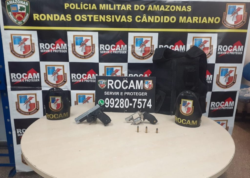 Policiais militares das Rondas Ostensivas Cândido Mariano (Rocam) detiveram, na madrugada desta quinta-feira (03/12), um homem de 21 anos em posse ilegal de uma arma de fogo, no conjunto João Paulo II, bairro Jorge Teixeira, zona leste da capital. Com ele foram apreendidos ainda um simulacro de arma de fogo e um colete balístico.