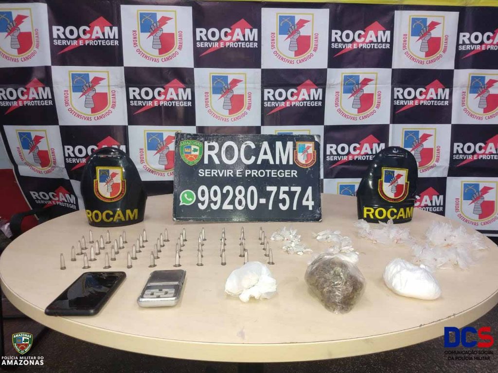 Policiais militares das Rondas Ostensivas Cândido Mariano (Rocam) detiveram, nesta quinta-feira (12/09), às 23h, um homem de 23 anos em posse de substâncias entorpecentes no bairro do Mauazinho, zona leste da capital. Com ele, foram apreendidas uma porção de pó branco supostamente cocaína, uma porção média de maconha, 50 pinos de cocaína, uma balança de precisão, um aparelho celular, uma porção de pedra de oxi e mais 123 trouxinhas de cocaína.
