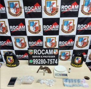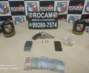 No bairro Tancredo Neves, por volta de 0h45, na rua Esmeralda, após denúncias, a Rocam deteve um homem de 35 anos, flagrado portando um revólver calibre 38 com três munições intactas; três porções de possivelmente oxi; uma balança de precisão; R$ 43,00 em espécie e um aparelho celular. O detido, que possui passagem pela polícia por tráfico de drogas, juntamente com o material apreendido, foi encaminhado ao 14º DIP.
