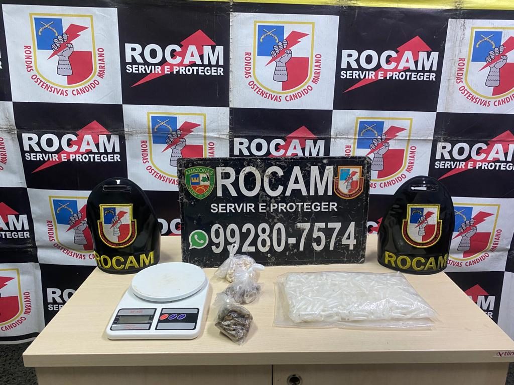 Policiais militares das Rondas Ostensivas Cândido Mariano (Rocam) detiveram, na tarde desta terça-feira (10/03), um homem suspeito de tráfico de drogas no bairro São Raimundo, zona oeste da capital. Com ele os policiais apreenderam 434 pinos de supostamente cocaína, nove porções de supostamente oxi, duas porções de supostamente maconha e uma balança de precisão.