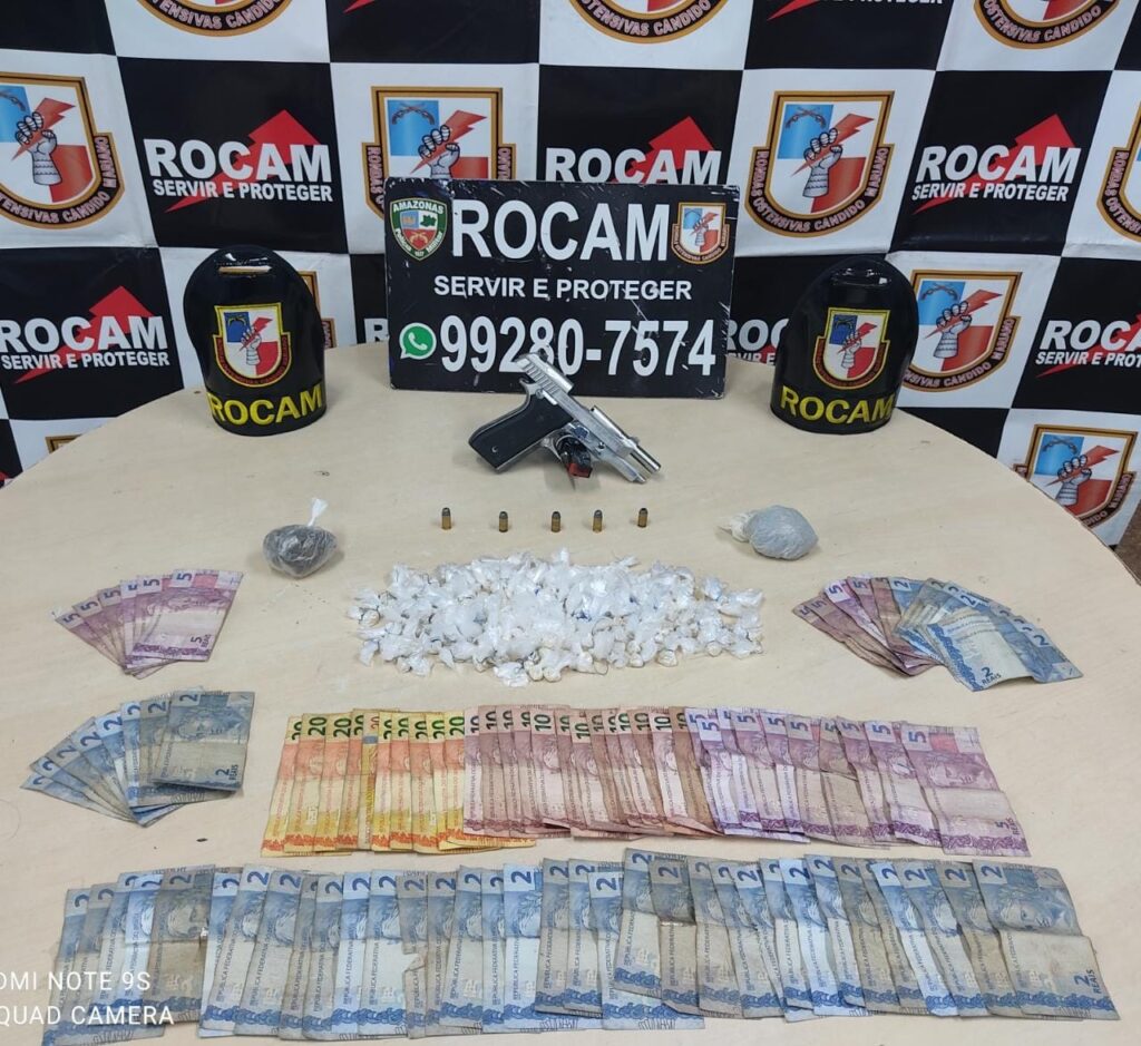 Por volta da 1h de hoje, a equipe militar Rocam 9841 deteve um jovem de 22 anos, em posse de armas e drogas, durante incursão no bairro Jorge Teixeira, zona leste. Os policiais avistaram o indivíduo entre as ruas das Tulipas e Samambaia, portando uma mochila, em atitude suspeita. Ele ainda tentou fugir ao notar a presença policial, mas foi alcançado.