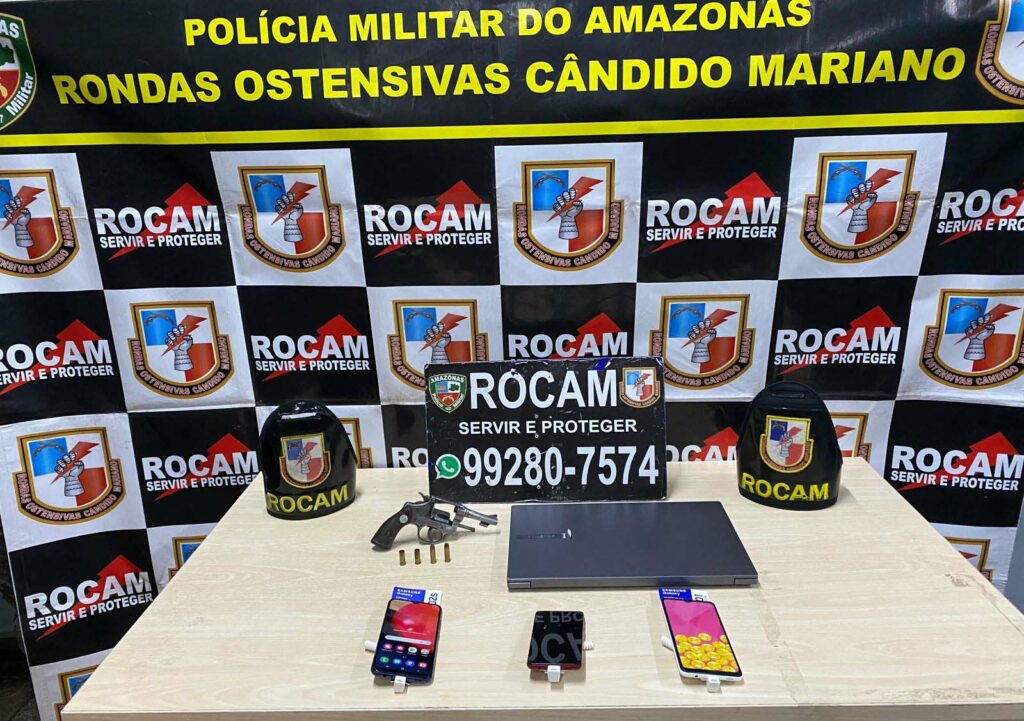 O outro suspeito foi detido e encaminhado ao 6º DIP, onde foi constatado que ele já tinha passagem por roubo. Na ação, foram apreendidos uma arma de fogo do tipo revólver, marca Taurus, modelo Special, calibre 32 e numeração 48744 com quatro munições calibre 32, duas deflagradas e duas intactas; um notebook; e três aparelhos celulares, além da motocicleta modelo Honda Fan, placa JXB-6455.