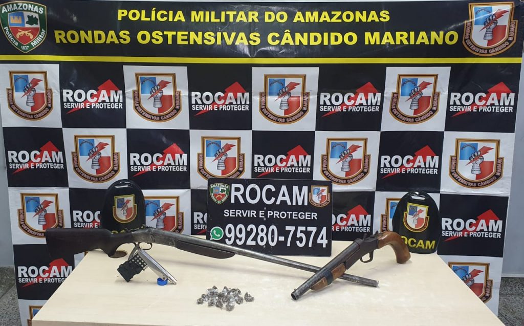 Policiais militares das Rondas Ostensivas Cândido Mariano (Rocam) detiveram, na noite deste domingo (27/09), um homem de 21 anos por porte ilegal de arma de fogo e tráfico de drogas no bairro Compensa, zona oeste da cidade. Com ele, os policiais apreenderam uma arma de fabricação caseira, tipo pistola, calibre desconhecido, uma espingarda calibre 20, sem numeração, uma espingarda calibre 12, sem numeração e 18 porções de supostamente maconha.