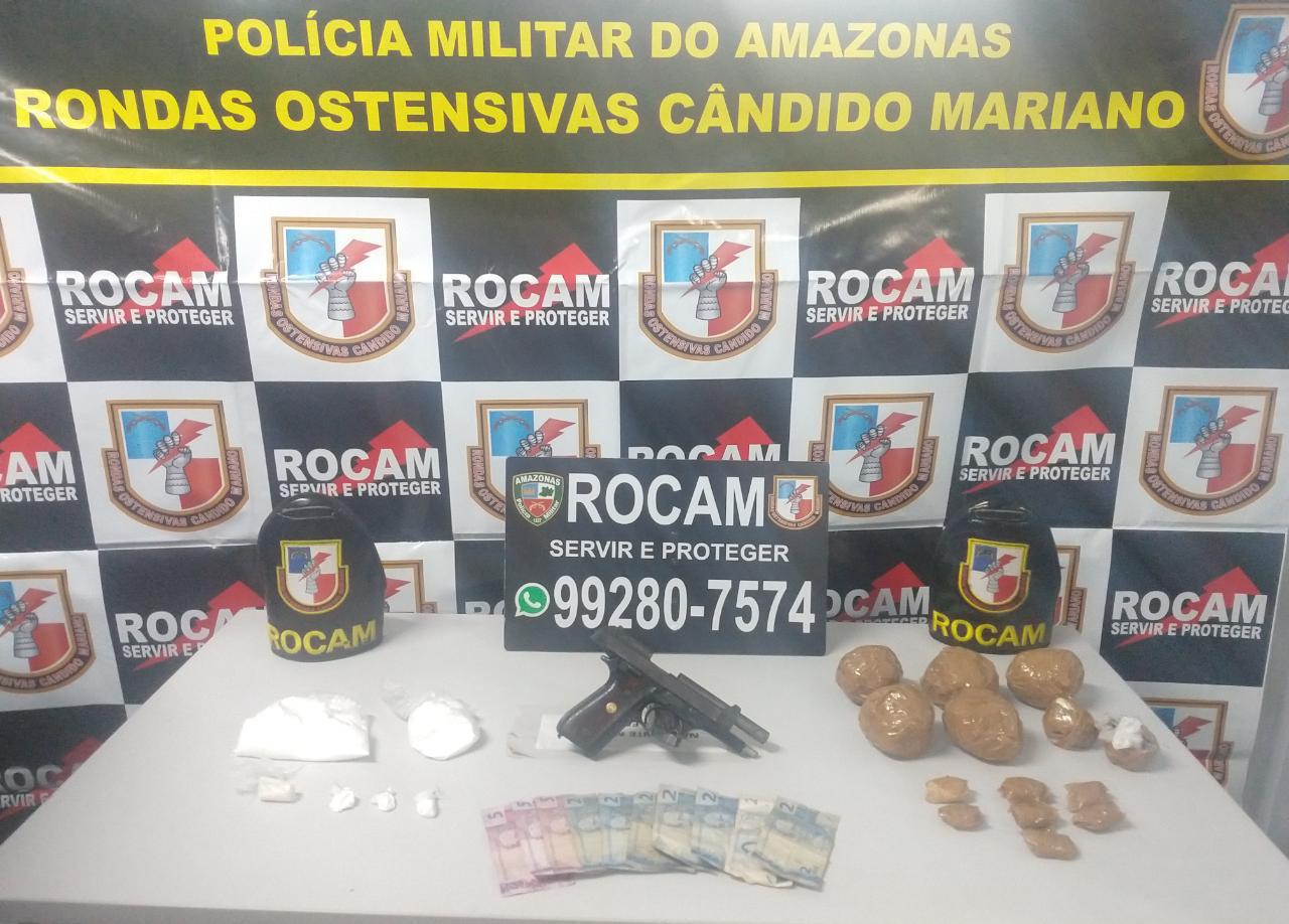 Policiais militares das Rondas Ostensivas Cândido Mariano (Rocam) detiveram, na noite desta segunda-feira (18/05), um homem de 44 anos por tráfico de drogas e posse ilegal de arma de fogo no bairro Japiim, zona sul da capital. Com ele, os policiais apreenderam uma pistola calibre .765, marca Taurus, modelo PT57SAMF, numeração M00651, com seu respectivo carregador; sete porções grandes de supostamente cocaína; duas porções médias de supostamente cocaína; oito porções pequenas de supostamente cocaína; três trouxinhas de supostamente cocaína; e a quantia de R$ 29,00 em espécie.