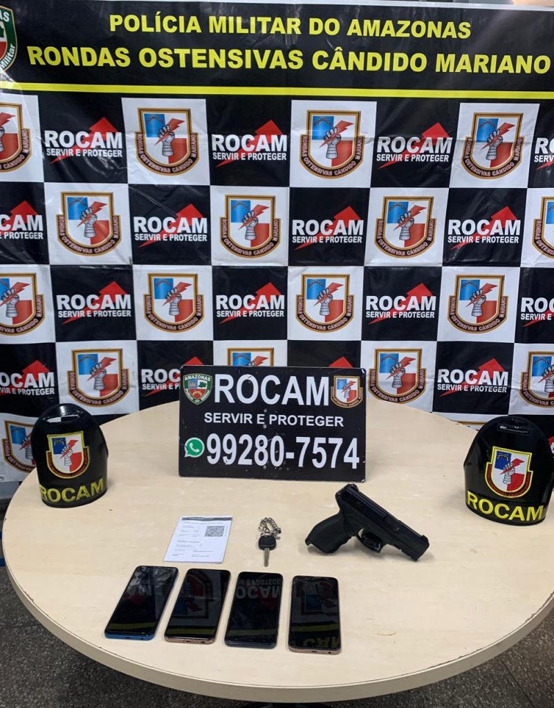 Policiais militares das Rondas Ostensivas Cândido Mariano (Rocam) detiveram, por volta de 2h30 desta terça-feira (10/11), quatro homens, dois deles de 20, um de 18 e outro de 21 anos, flagrados dentro de um carro cor prata, placa PHF6E53, na rua Rio Negro, bairro Gilberto Mestrinho, zona leste, com vários aparelhos celulares e um simulacro de arma de fogo.