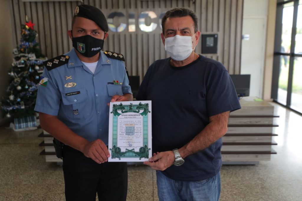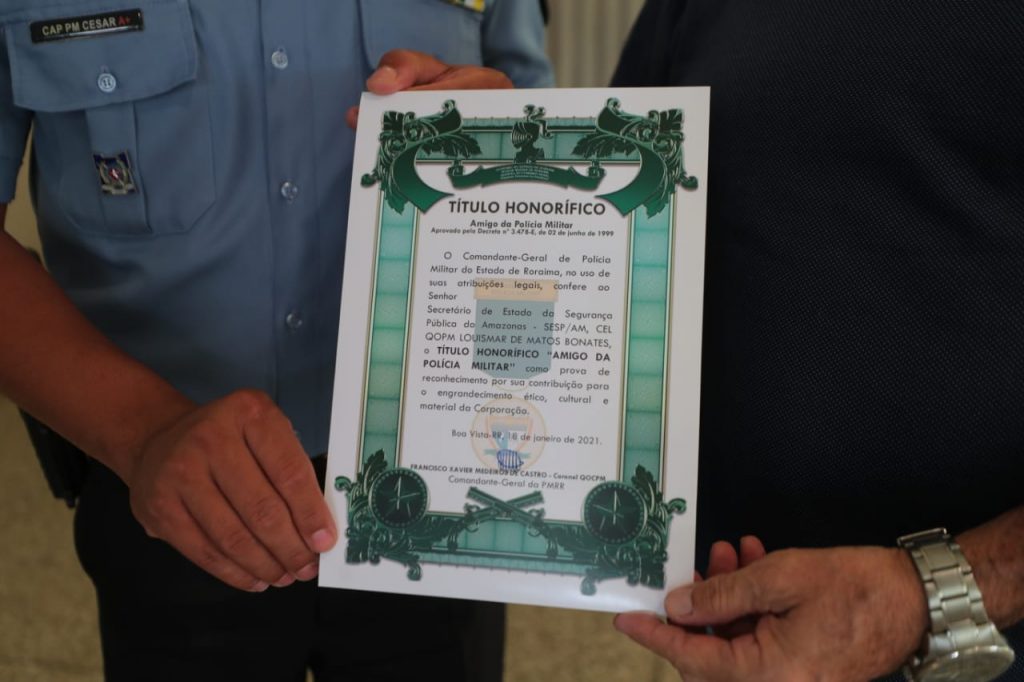 O secretário de Segurança Pública do Amazonas, coronel Louismar Bonates, recebeu na manhã deste sábado (23/01) o título honorífico de Amigo da Polícia Militar de Roraima (PMRR). A entrega da honraria aconteceu no Centro Integrado de Comando e Controle (CICC), onde o secretário tem coordenado as ações das forças de Segurança desde que entrou em vigor o decreto de restrição à circulação de pessoas como medida de enfrentamento à Covid-19.