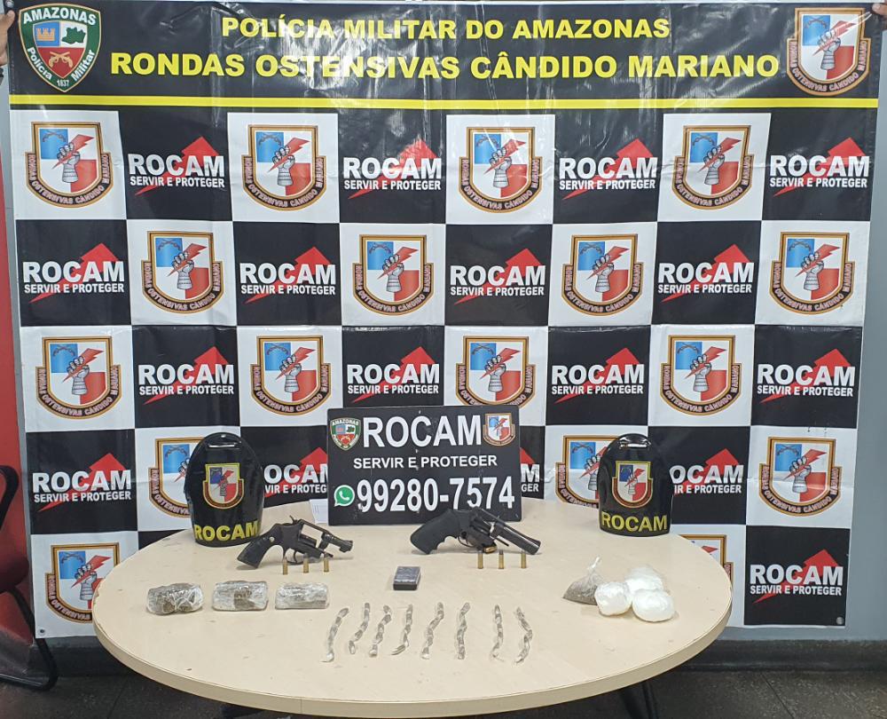 Policiais militares das Rondas Ostensivas Cândido Mariano (Rocam) prenderam, em flagrante, um homem de 33 anos na rua Jatuarana, bairro Jorge Teixeira, zona leste. Com o suspeito foram apreendidos dois revólveres calibre 38, seis munições intactas, 43 porções de entorpecentes e uma balança de precisão.