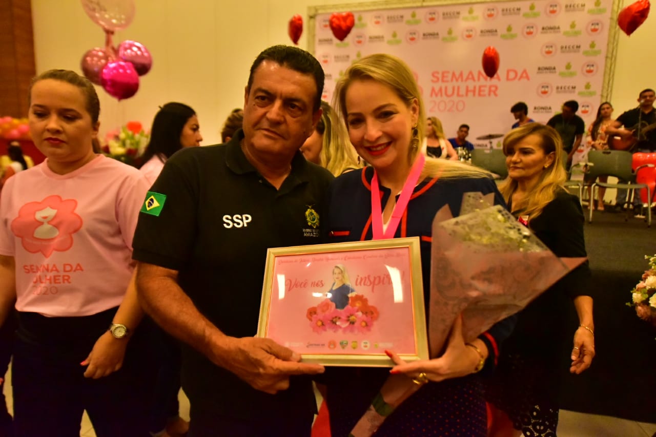 Os órgãos que compõem a Secretaria de Segurança Pública do Amazonas (SSP-AM) promovem, até a quinta-feira (12/03), a oitava edição da Semana da Mulher. Com o tema “Seja você. Por você. Pra você”, a iniciativa conta com a oferta de serviços gratuitos nas áreas social e de saúde a toda a população. A solenidade de abertura aconteceu nesta terça-feira (10/03), no Centro de Convenções do Amazonas Vasco Vasques, com uma série de homenagens às servidoras do Sistema de Segurança Pública estadual.