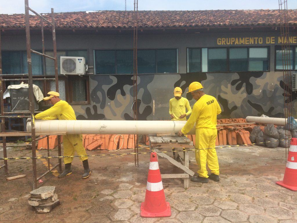 Agora, os reeducandos estão trabalhando na readaptação do antigo prédio de equoterapia, em alojamento para a equipe que trabalha na cavalaria, na construção da cobertura de viaturas e no reparo da fachada do Grupamento de Manejo de Artefatos Explosivos (Marte).