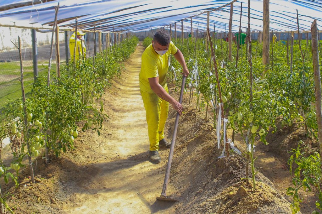 Um dos frutos desse trabalho ocorreu nesta quinta-feira (16/07) com a colheita de tomates na horta dentro do complexo. Esse serviço iniciou há cinco meses, em uma área de 400 metros quadrados. A atividade conta com a mão de obra carcerária de 12 apenados.