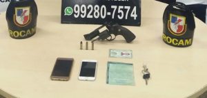 Por volta da meia-noite, durante uma abordagem, um homem de 25 anos, foi preso com um revólver calibre 38 com numeração suprimida e três munições intactas. A prisão ocorreu após denúncia aos policiais das Rondas Ostensivas Cândido Mariano (Rocam), via WhatsApp, informando que o suspeito estava em uma motocicleta cometendo roubos no bairro Castanheira.